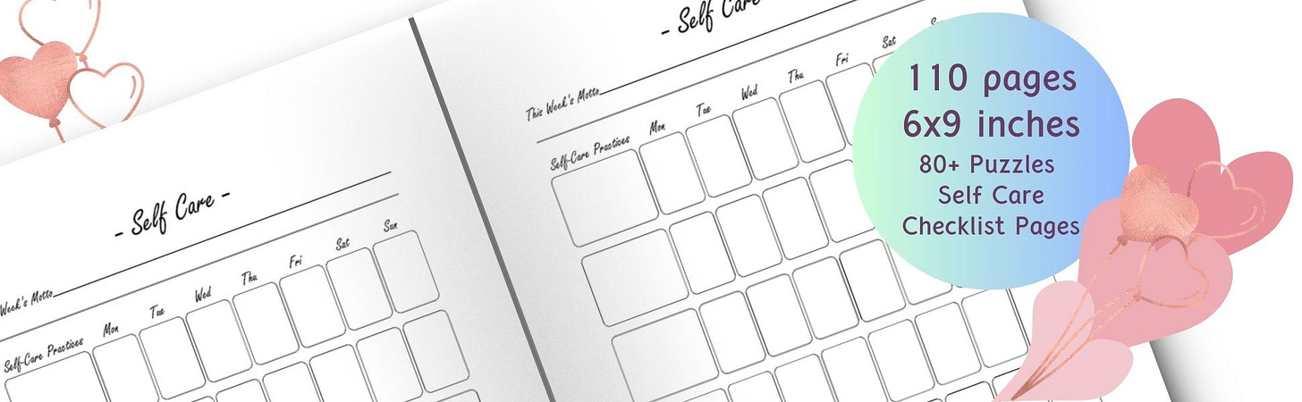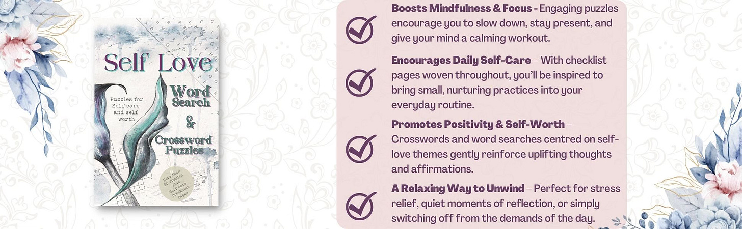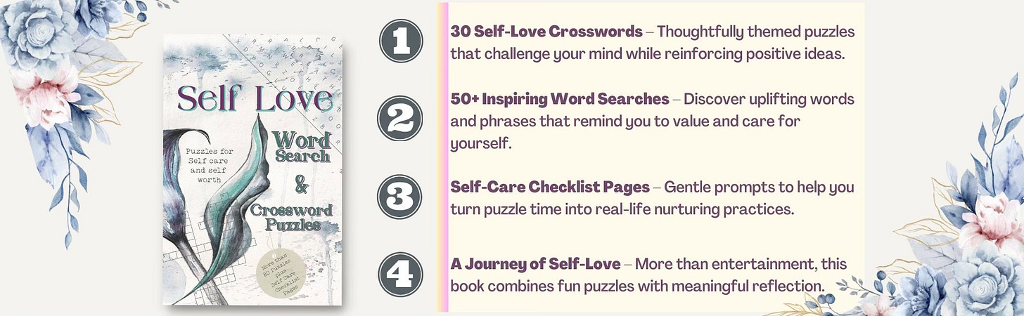 ✔️ 80 puzzles — a calming mix of word searches and crosswords focused on self-love, self-care, and self-worth